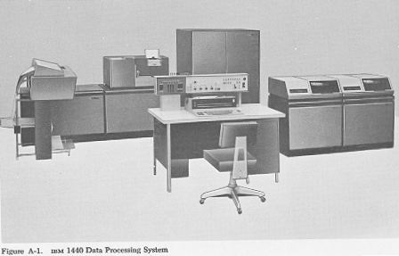 "It was also, er, um, _interesting_. If you did not also have a separate reader (I forget the number), you read and punched from the same hopper. We had the reader for the 1440, but not for our 1130. At least once some poor soul gang-punched his "Job card" into his entire input deck."Next in the line-up is the 1441 processor cabinet with the 1447 console in front of it. The disk drives look like they might be 2311 but are in fact probably 1311s.